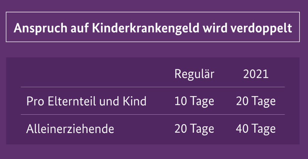 Die gute Nachricht gleich vorweg: Das Kinderkrankengeld wird rückwirkend zum 5. Januar 2021 erhöht. Nach dem von der Bundesregierung erst am 12.01.2021 verabschiedeten Gesetz können danach gesetzliche versicherte Eltern volle 20 statt wie bisher 10 Arbeitstage Kinderkrankengeld beantragen. Bei mehreren Kindern hat jeder Elternteil insgesamt einen Anspruch auf maximal 45 Arbeitstage. Für Alleinerziehende steigt der Anspruch ebenfalls: und zwar von 20 auf 40 Arbeitstage pro Kind. Bei mehreren Kindern haben Alleinerziehende insgesamt einen Anspruch auf maximal 90 Arbeitstage.