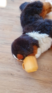 Frank: Anni hat ihrem Wauwau eine Tasse über die Schnauze gestülpt. Ich weiß nicht, ob sie im Fernsehen die Menschen mit Mundschutz gesehen hat und auch den Hund vor Ansteckung bewahren möchte?