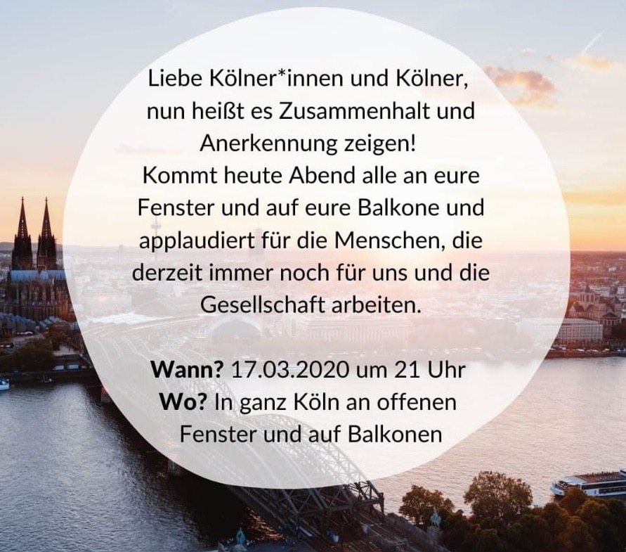 Thorsten: Ich persönlich finde das Klatschen jeden Abend hier im Veedel an den Fenstern für all die, die diesen Kraftakt in den Kliniken, Seniorenheimen und in den vielen vielen Supermärkten leisten, sehr bewegend. Da sind die Kinder auch voll dabei. Ich finde auch Klasse, dass es viele Freiwillige gibt, die sich für alles engagieren und denen zur Seite stehen, die es dringend brauchen. Das Konzert aus den Fenstern der Stadt soll ja heute Abend (Sonntag 22.03.2020 um 18 Uhr) stattfinden. Sophie (6) und Mia (8) spielen mit ihren Instrumenten auch und sie üben schon seit Donnerstag dafür.